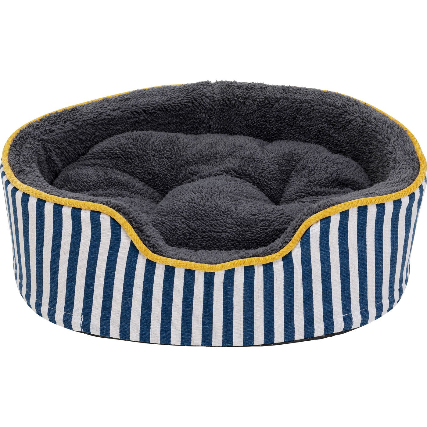 Ce lit pour animaux allie confort et style avec ses bords liserés bleu et blanc, rehaussés d’un liseré jaune sur le pourtour supérieur. Son centre gris ultra doux offre un espace de repos moelleux pour votre compagnon à quatre pattes.
