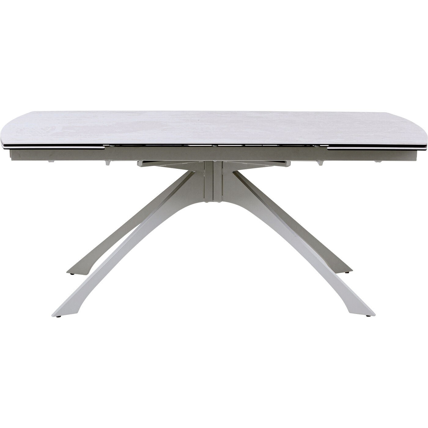 Cette table à manger contemporaine associe un piétement en acier beige au design épuré à un plateau en grès assorti. Le plateau principal mesure 180 cm de long et peut être étendu jusqu’à 260 cm grâce aux deux rallonges de 40 cm chacune. Livrée démontée. Peut supporter jusqu'à 40 kg. Pour 6 à 10 personnes. Chaque pièce est unique.