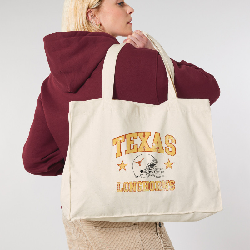 Grand Cabas Naturel de la marque American Universities. Un cadeau parfait pour Universités Americaines. Le motif Texas Longhorns Yellow est imprimé en France dans notre atelier à Toulouse sur un Grand Cabas de qualité très confortable 80% coton recyclé, 20% Polyester. Grand Cabas imprimé avec amour en France.
