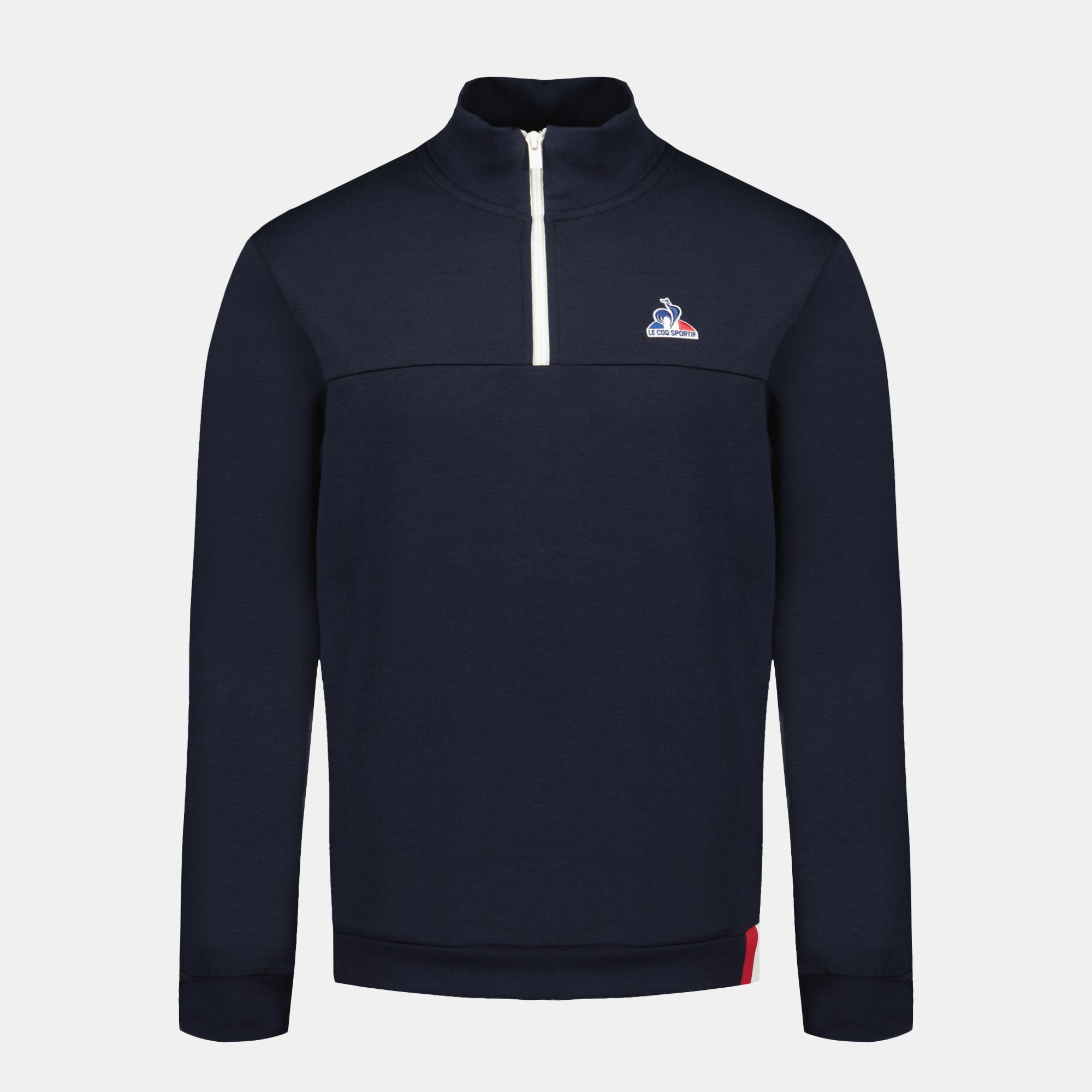 Adoptez ce sweat demi-zip bleu foncé, un essentiel de la collection Tricolore du Coq Sportif alliant confort et identité française. Confectionné en coton double face, il offre une douceur et une chaleur agréable tout en conservant une belle tenue. Le zip contrasté blanc apporte une touche moderne et élégante, facilitant l'enfilage et le réglage de la température. Un empiècement orné de bandes appliquées rouge et blanche vient habiller le bas du corps côté gauche, soulignant avec finesse l'héritage tricolore de la marque. Le logo brodé tricolore, placé côté cœur, affirme avec authenticité les valeurs et le savoir-faire français du Coq Sportif. Une pièce tendance à avoir absolument ! Ce sweat demi-zip s'associe parfaitement au pantalon ou short de la même collection pour une silhouette à la fois sportive et élégante. CARACTÉRISTIQUES TECHNIQUES : - Sweat col montant zippé - Couleur : bleu marine - Double face 300gr 85%Coton 15%Polyester - Bonne tenue, agréable et doux au porté - Coupe regular/classique - Ouverture haut devant zippée, bandes tricolores sur côte 1x1 bas de corps côté gauche au porté - Côte 1x1 aux bas de manches, bas de corps et col - Badge brodé "Logo du Coq tricolore" appliqué sur la poitrine côté gauche au porté
