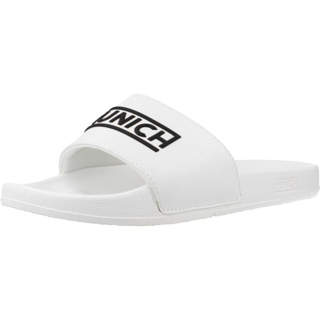 Modèle FLAT SLIDER D LOGO WH de marque Munich Blanc Doublure Textile. Extérieur Gomme. Type de construction: Coincé. Fabrique en Chine.