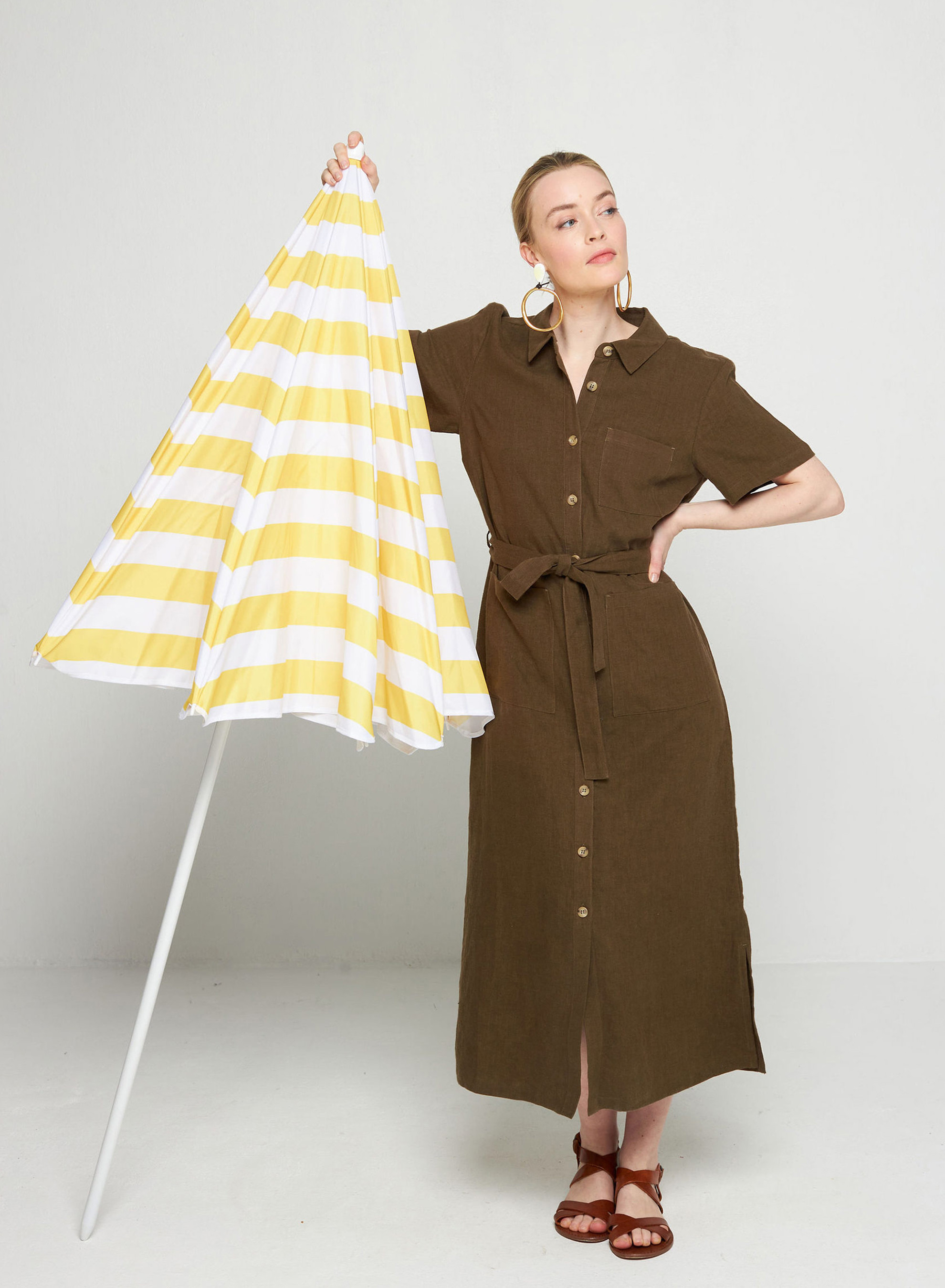 Longue robe chemise tricotée en lin. Une Robe qui vous accompagnera durant vos escapades estivales, sa matière est souple, agréable à porter à même la peau. Notre modèle se présente avec des poches de chaque côté, elle se ferme à l'aide de boutons sur toute sa longueur et possède des passants vous permettant d'intégrer la ceinture associée à ce modèle. Existe aussi en version Jupe, retrouvez notre modèle : Tourya.