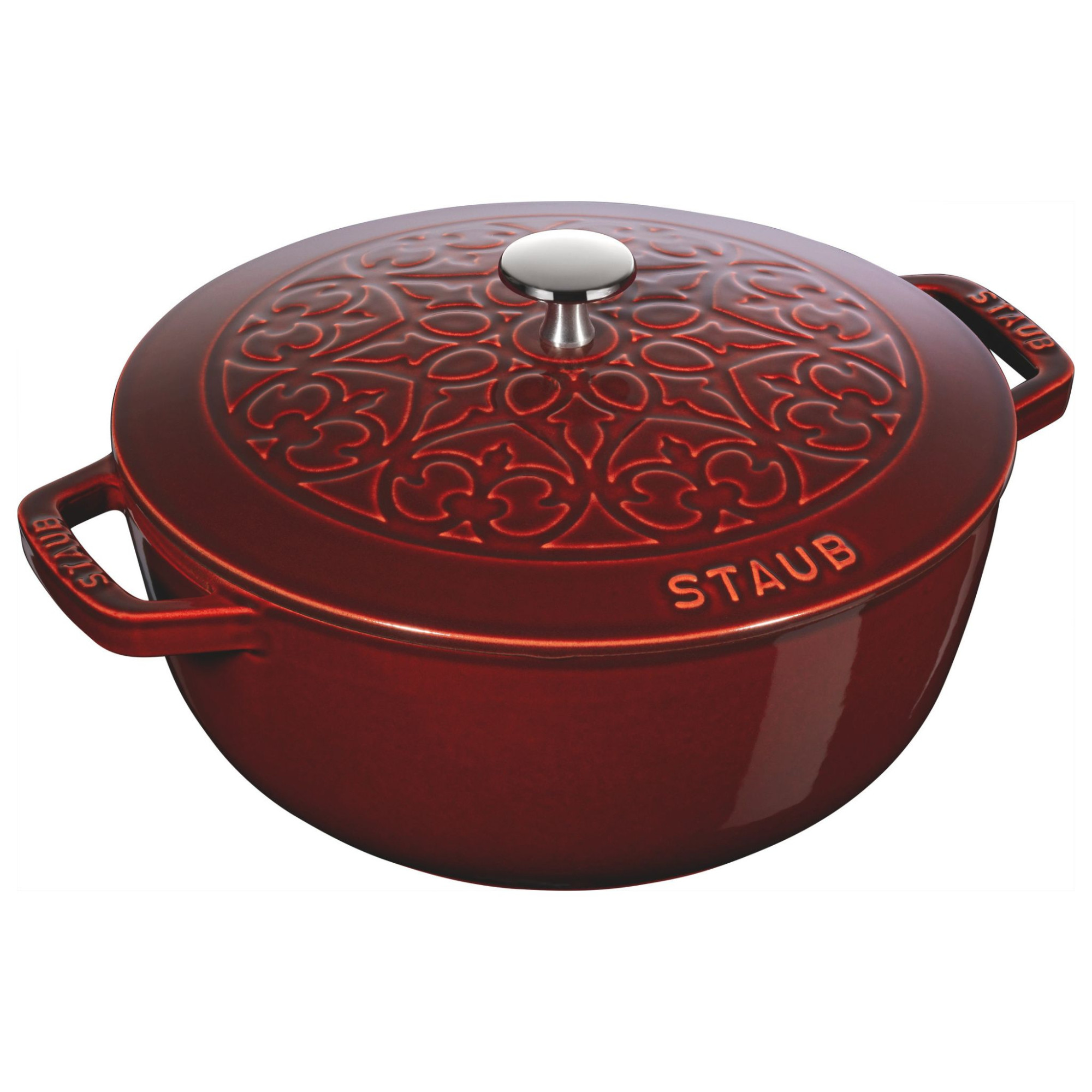 Information sur l'offre : Avec son design unique, cette cocotte STAUB Lys Grenadine met en valeur les plats de façon originale. L'intérieur de cette cocotte est émaillé noir mat, la marque de fabrique STAUB. Cet émail de qualité supérieure permet d'obtenir une meilleure résistance aux rayures et facilite l'entretien. Il possède les propriétés idéales pour saisir, rôtir et caraméliser les aliments. Avec un diamètre de 24 cm et une capacité de 3,6 litres, idéale pour 2-3 personnes, la cocotte peut être utilisée pour préparer des plats mijotés, des rôtis et de la volaille. Elle convient à toutes les sources de chaleur, y compris induction et four.