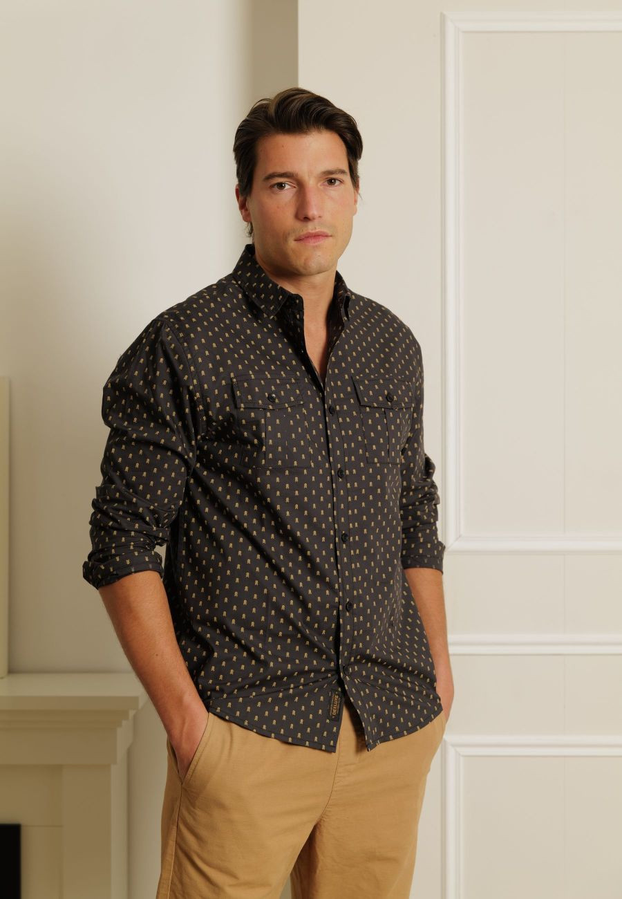 Cette chemise à manches longues séduit par son imprimé graphique régulier aux accents dorés, qui apporte une note originale sans en faire trop. Dotée d’un col classique et de deux poches poitrine à rabat boutonné, elle affiche un style à la fois urbain et décontracté. La coupe droite convient à toutes les morphologies et permet de la porter aussi bien rentrée qu’en surchemise. Un modèle facile à intégrer dans une tenue casual chic, que ce soit avec un chino ou un jean.