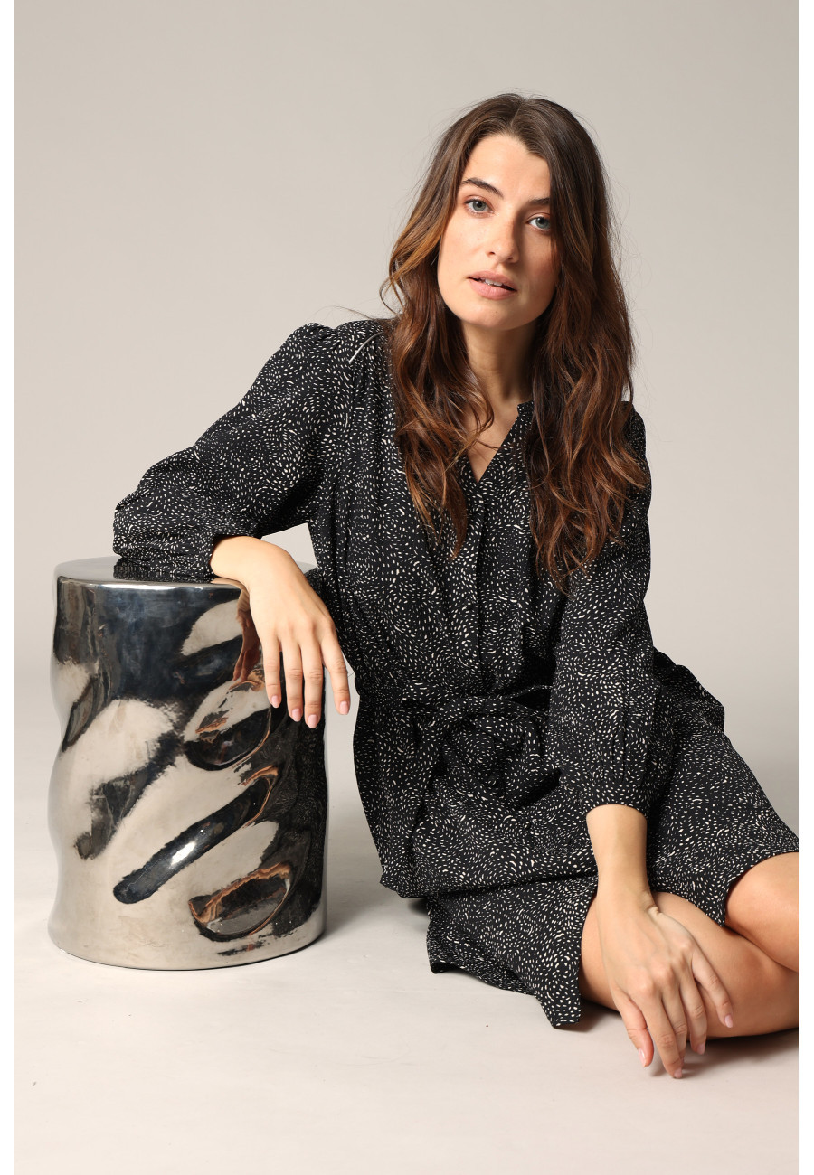 Cette robe féminine mise sur un charme fluide et un tombé léger grâce à sa coupe droite marquée par une ceinture à nouer à la taille. Conçue dans un tissu à imprimé moucheté, elle séduit par ses détails élégants comme son col en V sans col, ses manches longues bouffantes resserrées aux poignets, ainsi que ses deux poches latérales pratiques et discrètes. Le tissu souple accentue le confort tout en conservant une allure raffinée. Idéale pour composer une silhouette moderne et soignée au quotidien ou pour une sortie habillée.