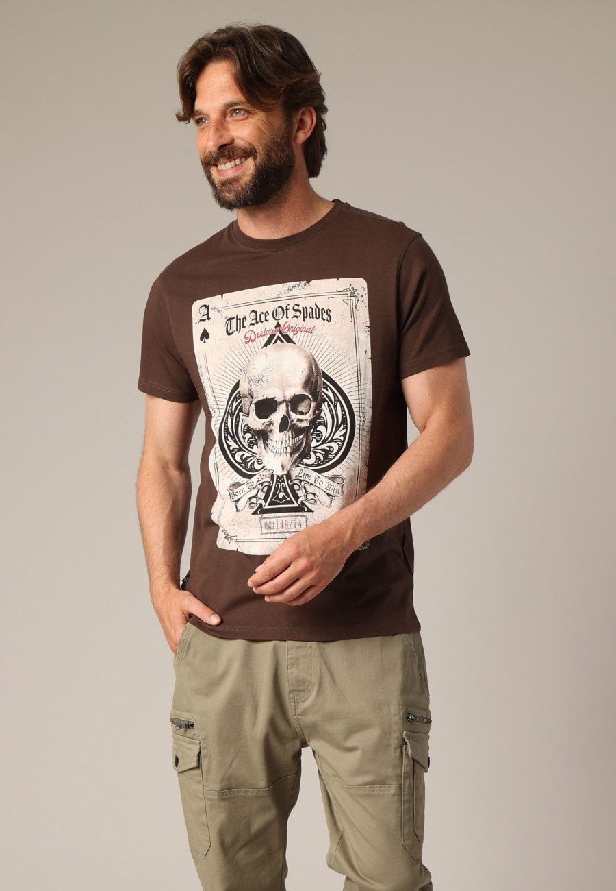 Le t-shirt ACE à manches courtes ose un visuel fort avec son grand motif façon carte à jouer "Ace of Spades", mettant en scène un crâne central et des inscriptions affirmées comme Born to lose, live to win. L'imprimé vieilli renforce l’esthétique rock et vintage du modèle, tandis que la coupe droite et le col rond assurent un confort optimal. Entièrement en coton, cette pièce assume un look rebelle avec une touche d’audace, parfaite pour réveiller un jean brut ou un chino clair.