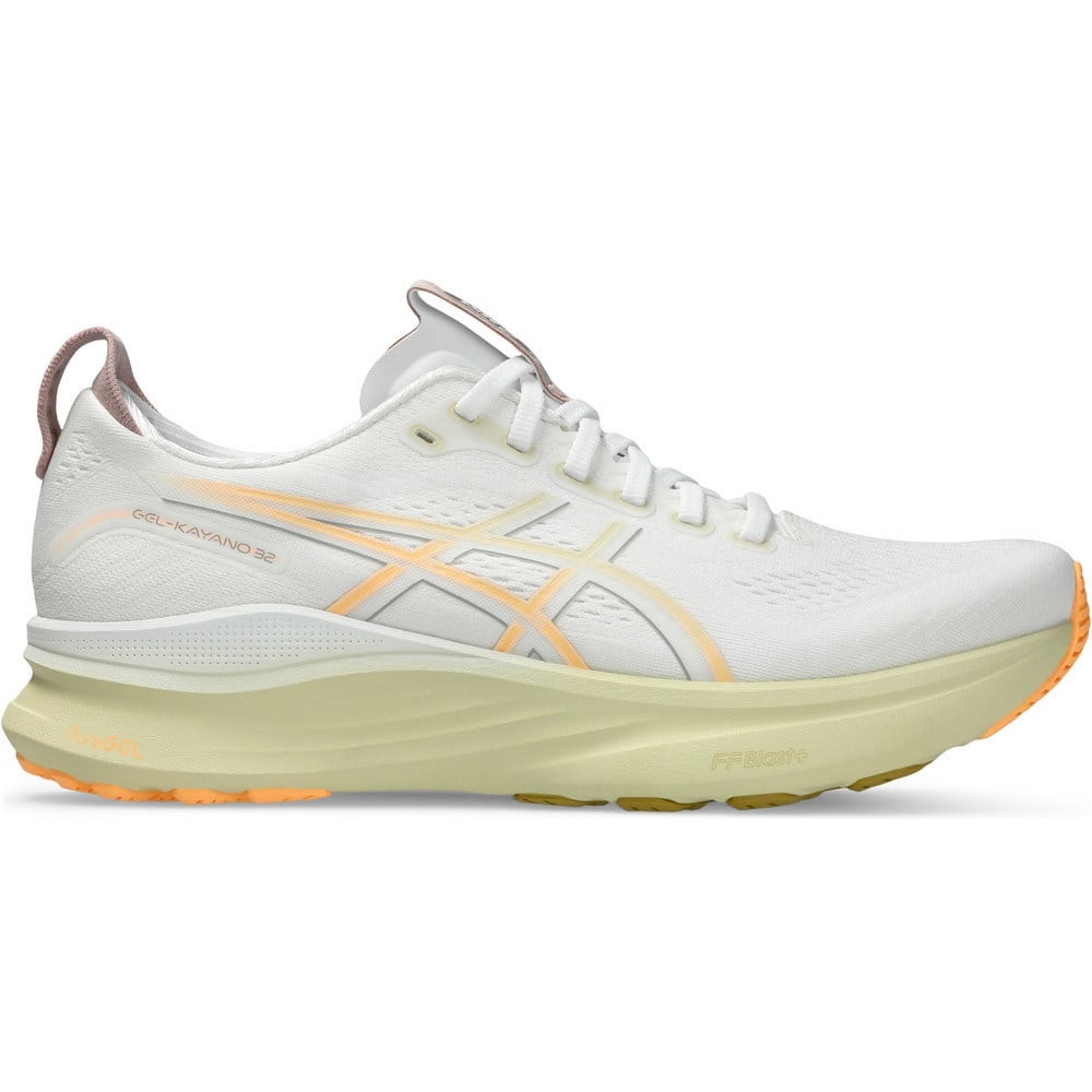 Pour rouler sur l’asphalte plus de 4 fois par semaine pendant pas moins de 60 minutes. La voici, la dernière évolution de l’une des chaussures de stabilité les plus emblématiques du monde de la course à pied. La chaussure de course pour homme Asics GEL-KAYANO 32 reçoit une mise à jour qui augmente ses performances et réduit son poids. La tige mise à jour intègre un col mis à jour et une languette plus technique et serrée, conservant toute la respirabilité, le confort et le soutien du milieu du pied afin que vous puissiez profiter du luxe, kilomètre après kilomètre. L’autre changement important vient de la semelle intermédiaire avec son drop de 8 mm, composée de la mousse FF BLAST™ PLUS ECO avec un amorti réactif avec une sensation de flottaison et combinée à la technologie PureGEL™ responsable de l’absorption des chocs réduisant la surcharge sur les articulations. Pour obtenir plus de stabilité et d’équilibre du pied, il dispose de la technologie 4D GUIDANCE SYSTEM pour™ un soutien adaptatif dynamique, sans rigidité. Enfin, la semelle hybride avec composés ASICSGRIP et AHARPLUS assure une excellente adhérence et une durabilité supérieure sur l’asphalte et les surfaces de chaussée. Cette chaussure est destinée au coureur en pronation qui a besoin d’un amorti maximal et d’un soutien fiable. Activez votre esprit avec la stabilité adaptable et le confort suprême de la chaussure GEL-KAYANO™ 32 !La partie supérieure des chaussures de course Asics GEL-KAYANO 32 White Yellow Orange est en maille extensible en monofilament tricoté qui améliore la ventilation et la légèreté avec un maximum de confort. Conception sans couture qui s’adapte comme un gant pour une compression optimale. Languette plus technique et renforcée pour apporter plus de confort et de soutien. Nouveau rembourrage sur le col avec garniture au talon et tirette en textile pour un enfilage facile. Détail de visibilité réfléchissant sur le contour.La semelle intermédiaire des chaussures Asics GEL-KAYANO 32 intègre l’amorti FF BLAST™ PLUS ECO qui permet une plus grande adaptation avec plus de légèreté et de réactivité. Il est complété par la technologie PureGEL™ pour garantir une absorption optimale à chaque impact. Technologie 4D GUIDANCE SYSTEM qui™ vous permet de stabiliser votre foulée et d’avoir plus de contrôle dans les transitions. Semelle intérieure OrthoLite™ X-55 qui améliore le confort.La chaussure de course Asics GEL-KAYANO 32 est dotée d’une semelle extérieure ASICSGRIP HYBRID large et plus ancrée, avec un mélange de caoutchoucs ASICSGRIP et AHARPLUS qui garantissent une traction exceptionnelle et une durabilité à long terme sur divers terrains.