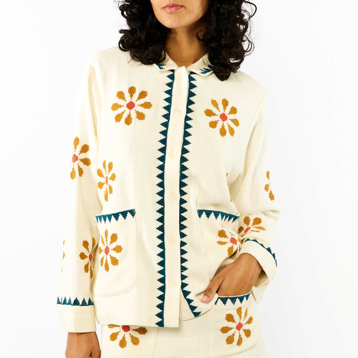 Doublée mais néanmoins assez légère, TOMAR, déclinée en quatre couleurs, est la pièce idéale pour une entrée de saison remarquée. Confectionnée en une maille de coton structurée qui lui donne un cachet fou, elle a une coupe droite assez large, un élégant petit col, des manches longues très légèrement resserrées aux poignets et deux poches plaquées pour une tenue impeccable. Dans sa version écrue, se déploient de très belles broderies florales caramel au design très seventies et une broderie contrastée en chevron bleu pétrole sur le haut des poches, le bas des manches, le col et de part et d'autre de la patte de boutonnage.
