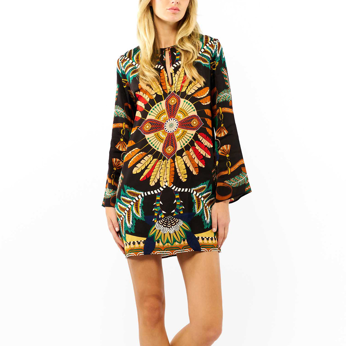 L'imprimé s'articule autour d'un extraordinaire disque solaire central qui dévoile une prodigieuse végétation aux feuilles multicolores. D'un graphisme riche et très évocateur, des éléments propres à l'univers équestre tels que des pompons ou un licol viennent compléter cet imprimé unique. Déclinée en trois couleurs, sa longueur genou et ses manches longues évasées lui confèrent cette touche seventies qu'on adore. Son col rond s'ouvre sur une forme goutte fermée par un joli petit bouton doré. Dans sa version noire, le fond est noir agrémenté de couleurs jaune maïs, rouges, caramel, vert bouteille et pêche.