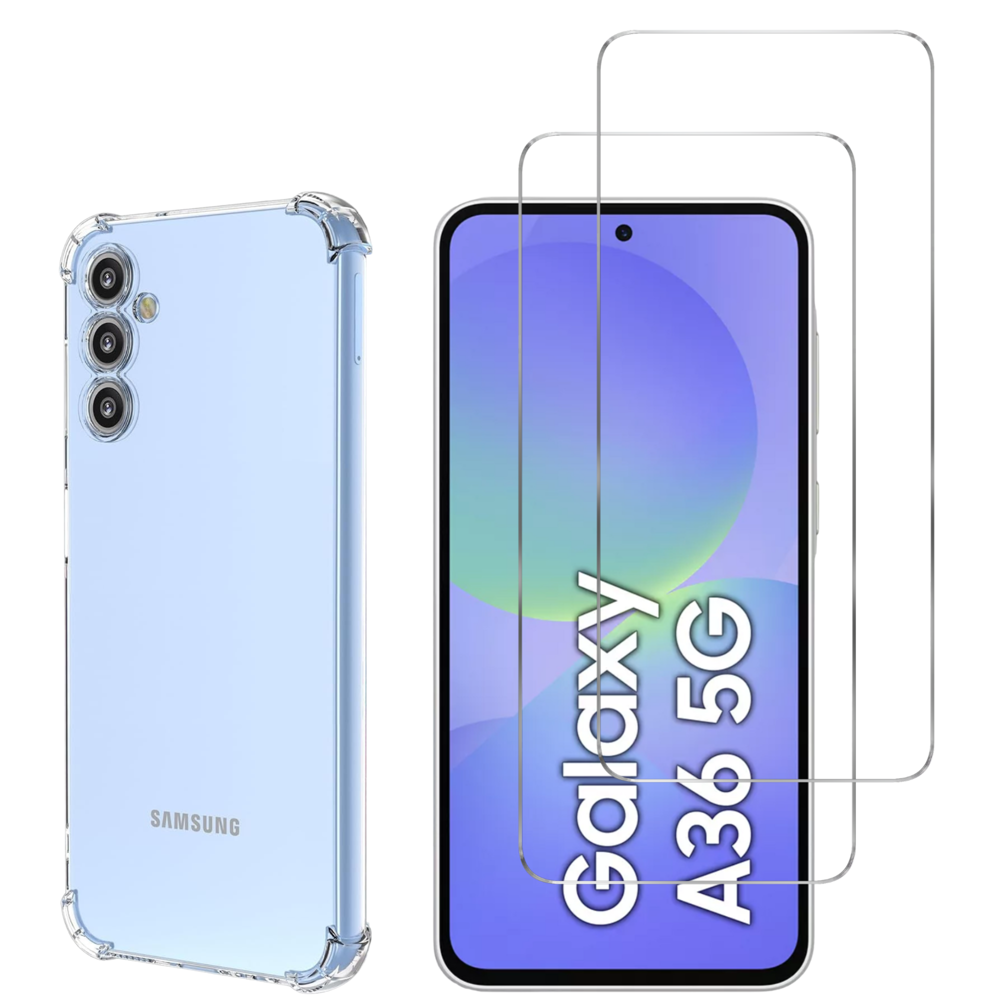 Compatible avec Samsung Galaxy A36 5G (écran 6,7 pouces). Pack de 1 Coque arrière en silicone souple Transparente + 2 Verres Trempé avec Lingettes nettoyantes. Coque avec Protection renforcée aux 4 coins.