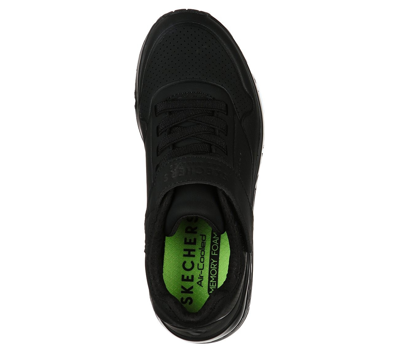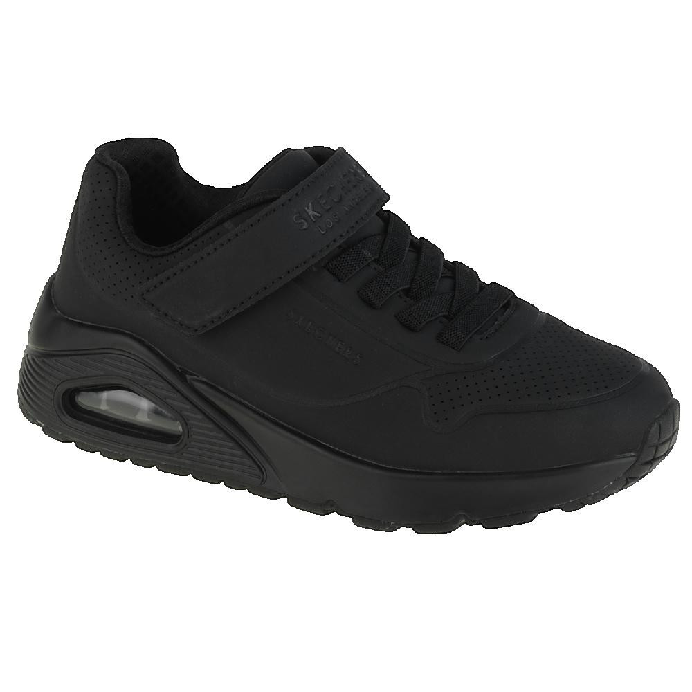 Les chaussures SKECHER Street Uno - Air Blitz sont des baskets lifestyle pour homme junior, conçues pour un usage quotidien. Elles présentent une tige synthétique à texture de cuir lisse, avec des lacets extensibles, des surpiqûres et des perforations pour un style classique et moderne. La semelle intérieure est en mousse à mémoire de forme refroidie par air, offrant un confort optimal, tandis que la semelle intermédiaire dispose d'un coussin d'air visible pour un amorti supplémentaire. Ces sneakers noires allient design et fonctionnalité, parfaites pour un look urbain décontracté.