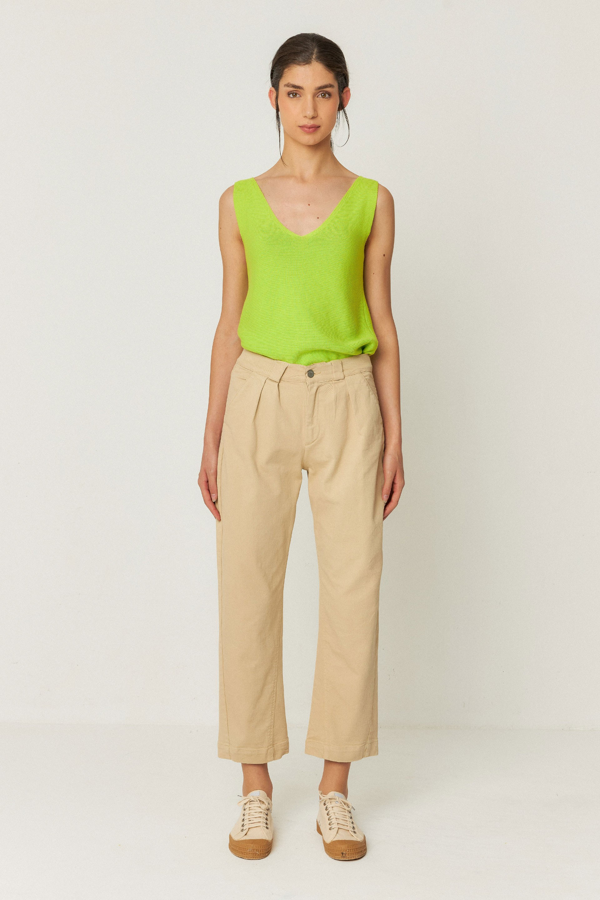 Pantalon décontracté longueur cheville avec poches latérales et fermeture zippée sur le devant. 95 % coton biologique - 5 % élasthanne. Lavage à froid, cycle délicat. Repassage à basse température. Ne pas blanchir. Ne pas nettoyer à sec. Ne pas sécher en machine. Laver à l'envers. Laver avec des couleurs similaires. Repasser à l'envers. Ne pas repasser l'imprimé.