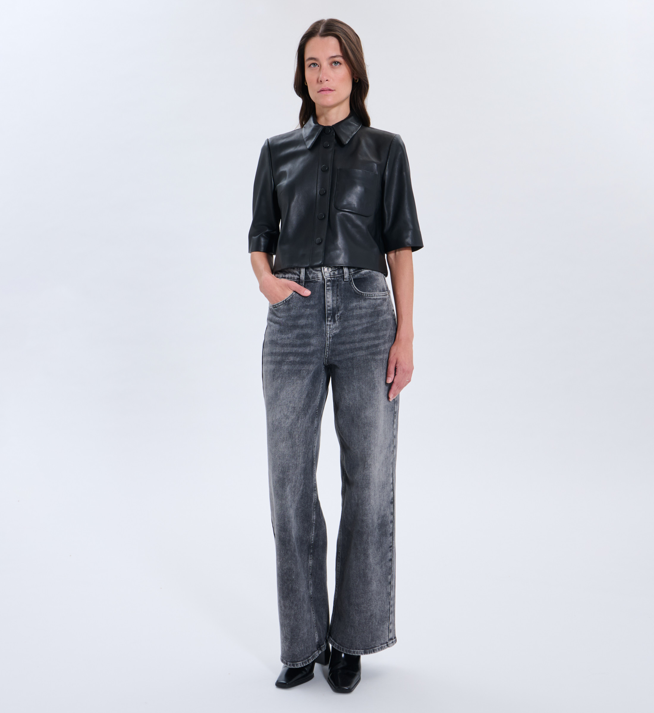 La pièce forte de la saison, la chemise Celina impose son style avec une matière noble en cuir d’agneau. Sa coupe courte et droite lui confère une allure contemporaine, parfaite pour un look urbain et sophistiqué. À associer sans hésiter avec un jean clair pour un total look moderne et décontracté. Chemise courte Coupe droite 100 % cuir d’agneau Ouverture boutonnée Manches courtes Col chemise Poche plaquée devant Coloris noir