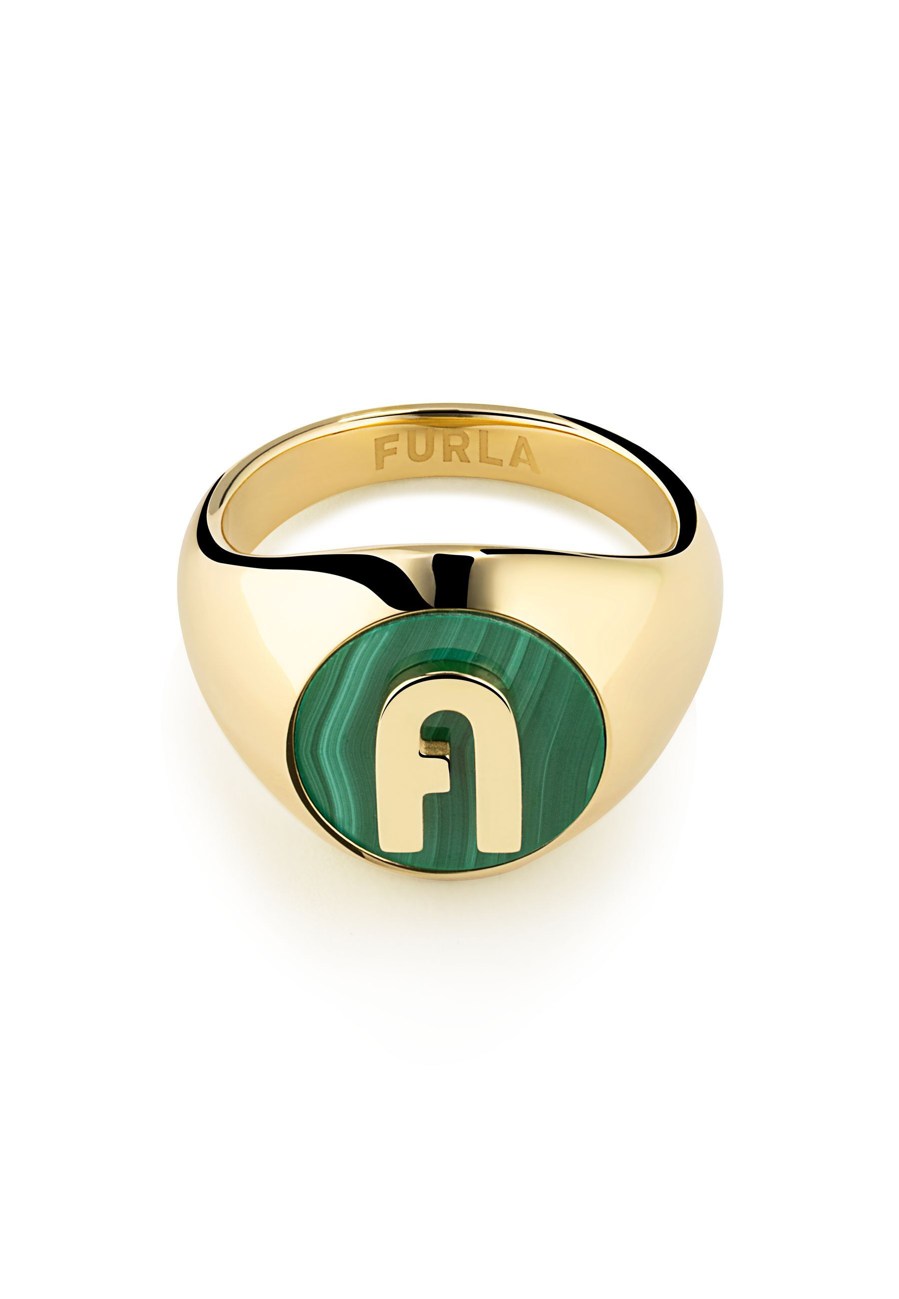 Furla Furla Stones anneau Une chevalière à logo intemporel et unisexe présente l’arche Furla, dotée d’un cadre glamour dans un ton or jaune rougissant sur de l’acier inoxydable et une pierre précieuse de malachite verte. Une pièce sur mesure qui complète tout ce qui se trouve dans votre garde-robe, pour toutes les occasions, du décontracté à la cravate noire.