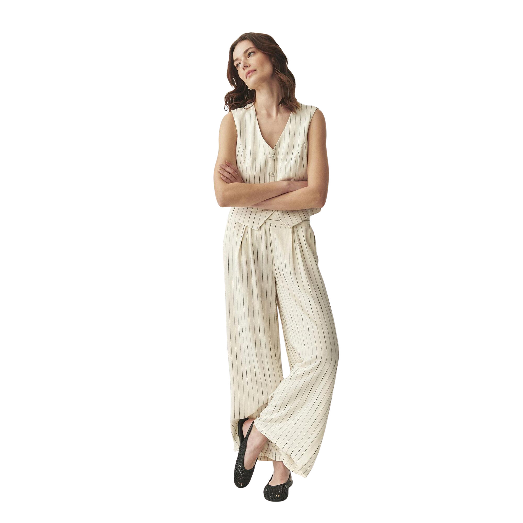 Léger, structuré et subtilement élégant - ce gilet est un clin d'œil aux classiques avec une touche moderne. Fabriqué à partir d'un mélange aéré de viscose, de lin et de coton, avec une doublure pour encore plus de confort, il met en valeur la silhouette. Les rayures verticales allongent visuellement, et les boutons en tissu ajoutent une finition raffinée.