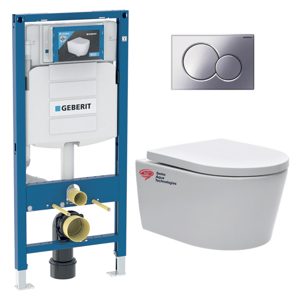 Pack WC bâti-support Geberit + WC sans bride Swiss Aqua Technologies + abattant SoftClose + plaque chrome (GebSATrimless-N)