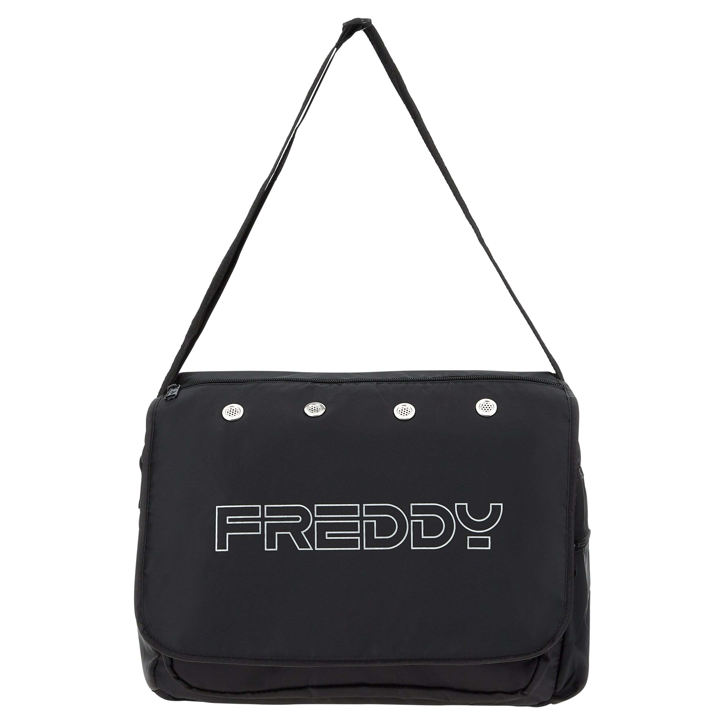 Besace en nylon monochrome décorée avec le maxi-impression FREDDY en contour à l’avant et le logo sur la poche latérale. Elle possède des zips pour fermer le compartiment principal et des poches avant et latérales pratiques. Des trous sur le rabat permettent l'aération. Bandoulière réglable. Le design et le tissu pratique rendent ce sac spacieux et polyvalent. Dimensions : 39 x 31 x 19 cm (L x H x P)
