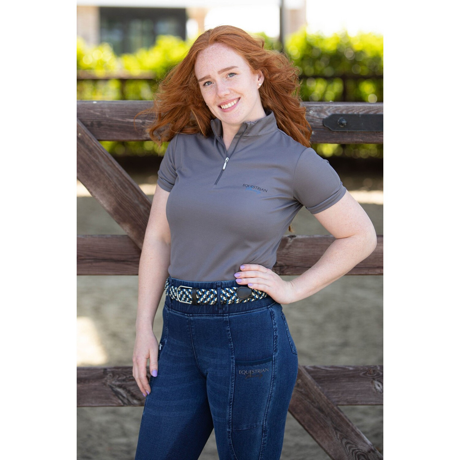 Polo avec une courte fermeture éclair, un passepoil argenté sur les manches et un imprimé de la Société Equestre sur la poitrine.Matériau : 100 % micropolyester.