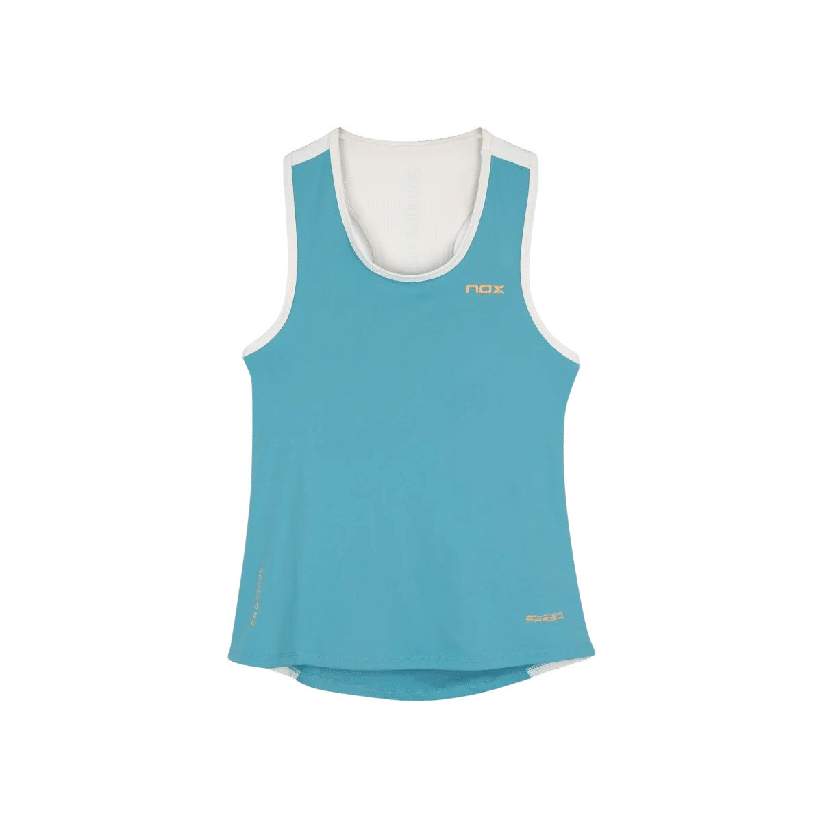 Léger et confortable en un seul vêtement. Le débardeur NOX PRO Dusty Turquoise pour femmes de NOX offre une liberté de mouvement maximale sur le court, avec une coupe confortable et un design qui flatte la silhouette sans sacrifier la fonctionnalité. Fabriqué avec un tissu respirant et la technologie Balance Fresh, ce débardeur aide à garder le corps au frais et au sec dans les moments les plus intenses. La coupe régulière La coupe régulière assure un ajustement parfait, tandis que la conception du dos offre un confort et une ventilation supplémentaires. Un vêtement polyvalent et fonctionnel, idéal pour les joueurs qui recherchent le confort, la fraîcheur et une touche de style à chaque match. Caractéristiques techniques Technologie Balance Fresh:  Fabriqué avec la technologie exclusive de NOX, ce T-shirt garantit une excellente respirabilité et une grande fraîcheur, même lors des matchs les plus exigeants. Il garde la peau sèche et confortable, en aidant à réguler la température corporelle. Matière de haute qualité:  Fabriqué dans un tissu léger et extensible composé de 92% de polyester et 8% d’élasthanne, ce tee-shirt offre une totale liberté de mouvement, essentielle pour un jeu de padel dynamique. Coupe ergonomique:  La conception du dos nageur offre un ajustement parfait, permettant une gamme complète de mouvements des bras sans restriction. Les coutures flatlock minimisent le risque de frottement et assurent le confort tout au long du match. Entretien facile:  La matière résistante conserve sa forme et sa couleur lavage après lavage, ce qui permet au vêtement de conserver son aspect neuf pendant longtemps. Avantages de choisir le débardeur padel Pro Dusty Turquoise Confort de mouvement:  Conçu pour maximiser la liberté de mouvement, ce débardeur est parfait pour les sessions intenses sur le court, vous permettant de vous concentrer sur votre performance. Style sportif et sophistiqué:  Avec un design qui allie élégance et fonctionnalité, ce maillot ne se contente pas de vous mettre en valeur, il vous permet également de donner le meilleur de vous-même. Polyvalence dans le jeu:  Idéal pour l’entraînement et la compétition, son design ergonomique et ses matériaux de haute qualité s’adaptent à toutes les situations sur le terrain. Spécifications du produit Composition:  Polyester 92% – Spandex 8%. Modèle:  Taille S – hauteur 1.70m