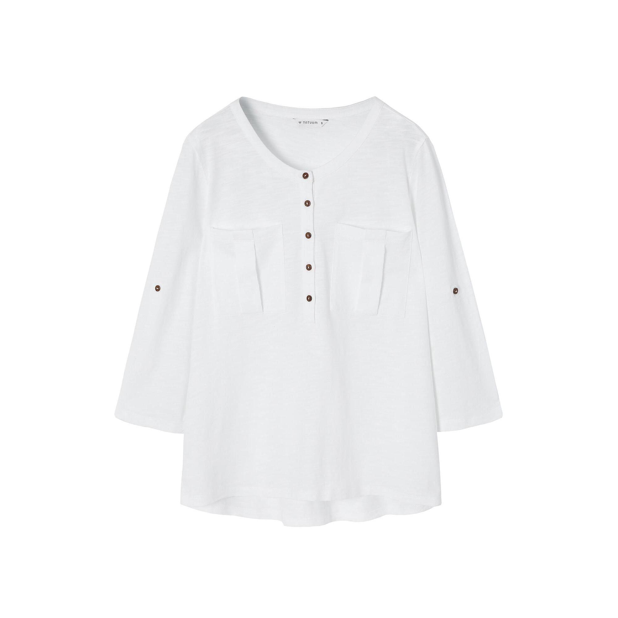 Cette blouse classique en mélange de coton aérien est une option confortable et stylée pour le quotidien. Elle dispose de manches 3/4 avec la possibilité de les retrousser, vous permettant ainsi d'ajuster facilement la longueur selon vos besoins. Un col rond agrémenté d'une rangée de boutons évasée ajoute une touche subtile, tandis que deux poches décoratives sur le devant apportent une note décontractée légère.